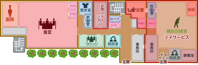 ヘルパーステーション及びデイサービスを併設し、デイサービスにある浴室では温泉浴をお愉しみ頂けます。食堂はゆったりと食事が楽しめるように広い食堂をご用意しております。